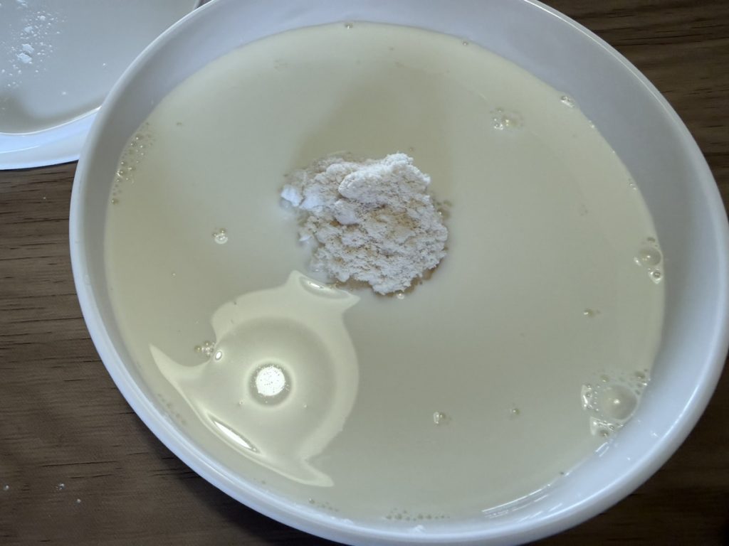 ①耐熱ボウルに牛乳・片栗粉・砂糖を入れ、ダマがなくなるまでよく混ぜる。