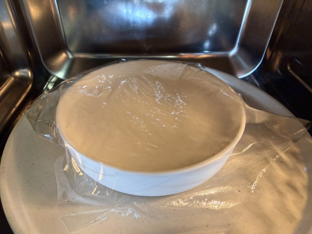②ふんわりラップをして、600Wで1分加熱。一度取り出してしっかり混ぜ、再び1分加熱。とろみがついたら、さらに30秒〜1分加熱し、つやっと透明感が出るまで混ぜる。